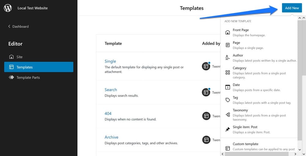 In the Templates menu, you are able to create custom page templates via the Add New button in the upper right corner.