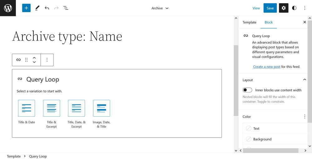 Query Loop allows you to add custom content to your pages very easily. When you input it into the page, you have two options: start with a block pattern or a blank template. When choosing the second option, the block asks you to pick whether to display your content title, date, excerpt and/or image.
