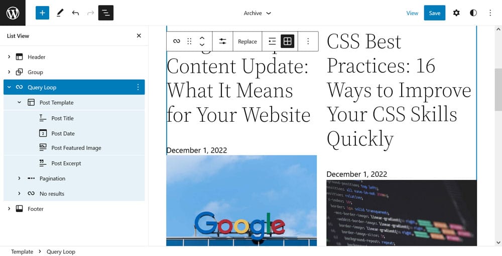 Besides that, you can customize what information shows up for each post in the loop. The easiest way to do that is via list view in the upper left corner. It allows you change the order of the post title, featured image, and date. You can even add things like excerpts (see also the next item in this list). Any change to Post Template will affect every single item in the Query Loop.