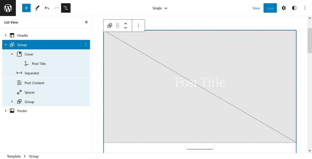 - Move Post Title inside the Cover block, center it, and change its color to white.