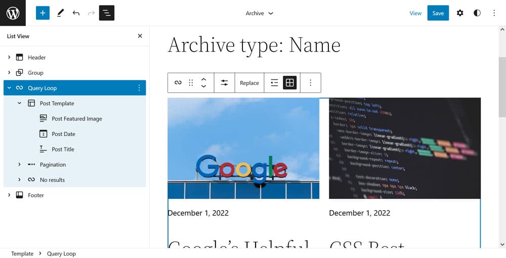Finally, you are able to change the design of the content very easily. For example, you can switch the loop between list and grid view in the block settings bar on top.