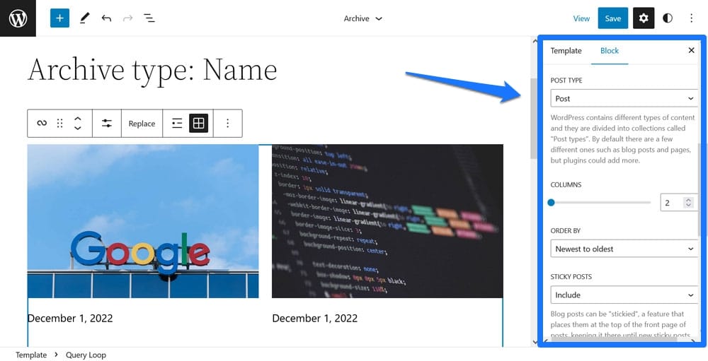You can a) choose the post type that you want the block to output and b) add filters for what posts or pages show up. For example, you can direct the loop to only show content from certain categories, authors, or with certain keywords. In addition, you have the ability to order it from newest to oldest, the reverse, or either direction of the alphabet.
