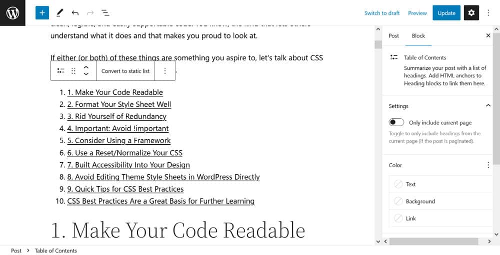 Sure, there is room for improvement. The current lack of customization options is a bit of a bummer. Page jumps also don’t work in preview because the block uses the URL slug of the finished post. However, it still makes the process of adding a table of contents in WordPress much easier.