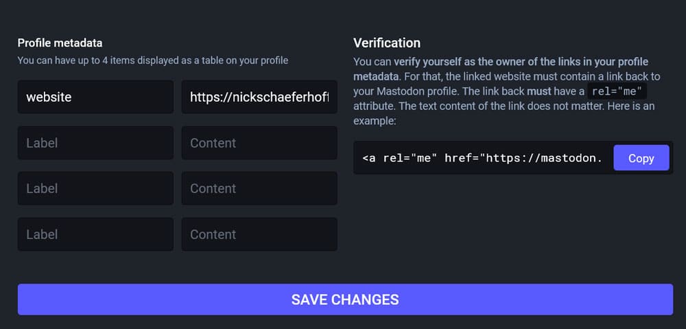 This is perfect for things like adding your website address or other Internet presences you think your visitors and followers should know about. Finally, there is an example link if you want to verify your Mastodon profile through your website.