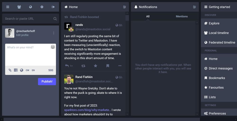 Once your account has been established and you are logged in, you land on the main Mastodon interface.