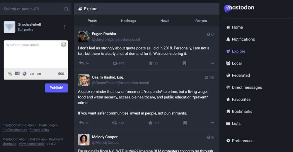 - Explore — Posts, hashtags, and news that are trending across the Mastodon universe as well as recommended profiles for you. Note that you can also find trending hashtags at the bottom right of the screen.