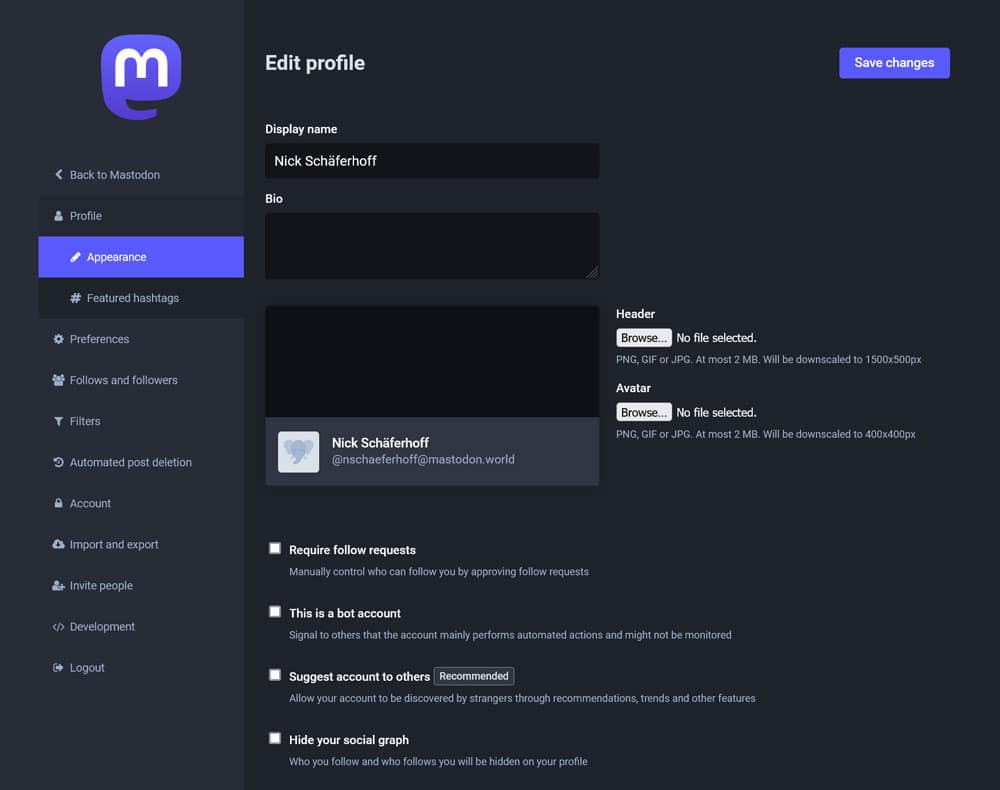 Like other social platforms, Mastodon gives you many different ways to share more information about yourself. You can do so using the Edit profile link in the upper left corner or when viewing your profile while logged in.