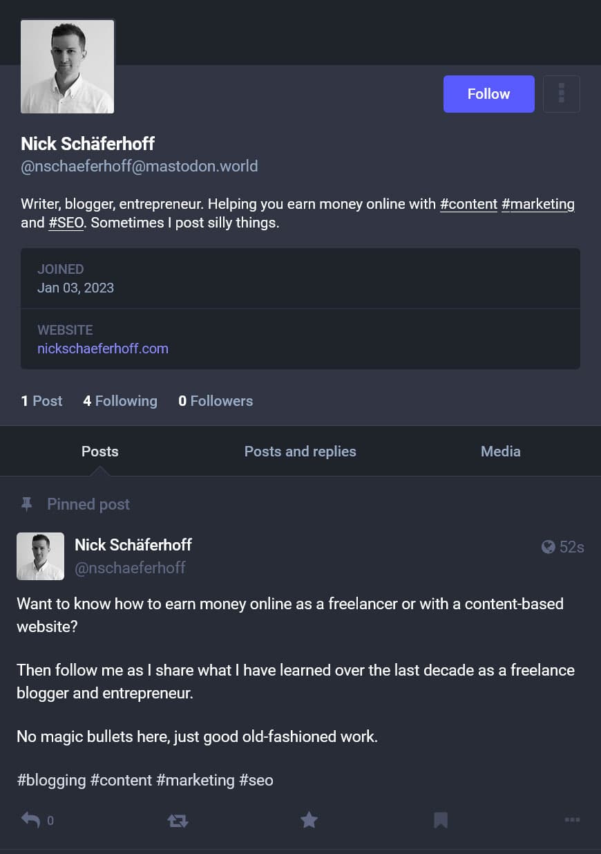 Now that you’ve got your bearings, you can properly start posting on Mastodon. Your first post can be a bit of background information on you, your interests, business or what else makes you tick. Post it, then pin it to the top of your feed. That way, visitors can get a good introduction to you and what to expect if they want to follow you.