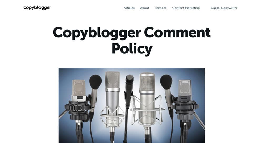 The Copyblogger blog also have their own dedicated page for the comment policy and link to it from the site footer. Here’s the gist of what it says:
