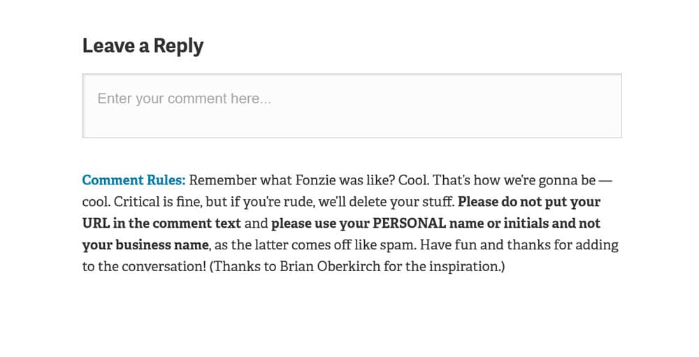 - No spam — You should already have spam plugin in place to catch genuine junk comments. However, some people still try to use spammy tactics in blog comments that make sense to ban. Examples include the use of a business name or URL as their name, trying to link from inside their comment, or purely promotional content.