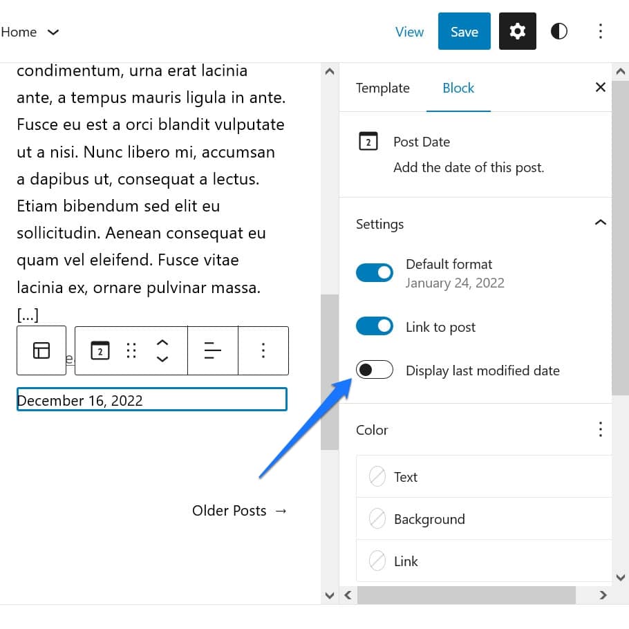 Another very small option that, however, can have a big impact. It regards the Post Date block, which is most often a default of the Query Loop. What’s easy not to notice is that it also has an option to show the last modified date. You can find it in the settings on the right when the Post Date block is active.