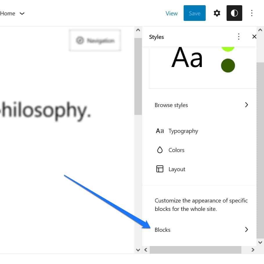 In the Global Styles menu, you also find another option that is sometimes a little neglected. Under Blocks at the bottom, you can make changes to individual types of blocks that will apply sitewide.