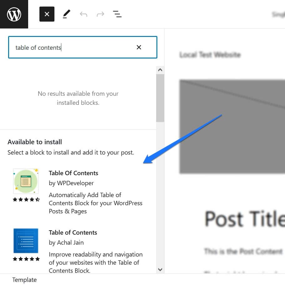 For example, say you are looking to add the aforementioned table of contents. For that, go to the block inserter (the blue button with a plus in the upper left corner) and type that keyword into the search field at the top. While you might not find anything available on your site, you will quickly see a section called Available to install at the bottom with relevant block results.
