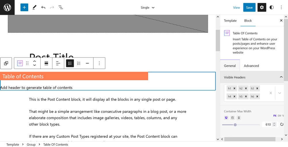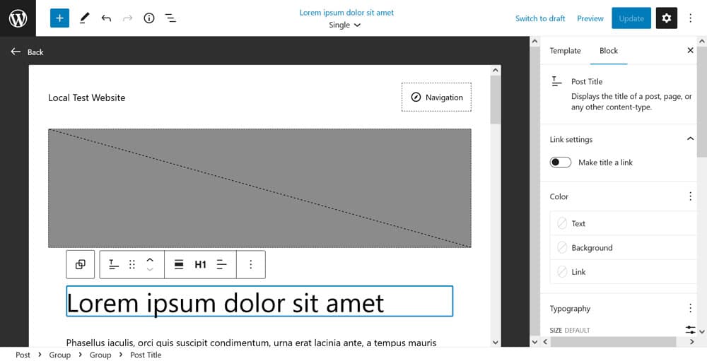 It’s a pared down version of the Site Editor, however, equally powerful. You can perform tasks like switching the position of your featured image and title, moving around elements, or even inputting a new header or footer. Upon save, the changes will apply to any page on your site that uses this template.