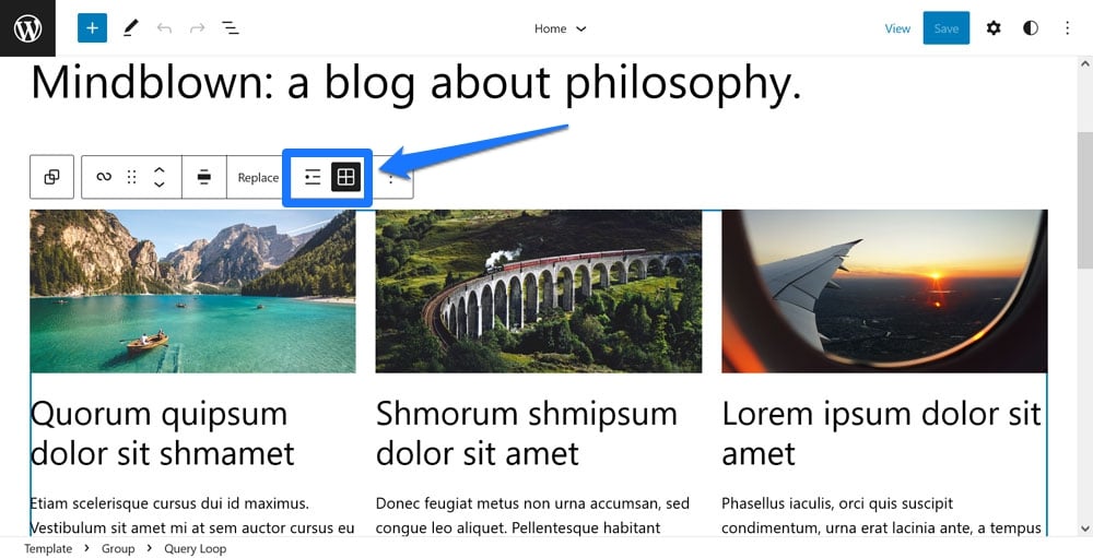 When using the Query Loop block to display a list of content anywhere on your site, you can switch it back and forth between a list and grid design in the top toolbar.