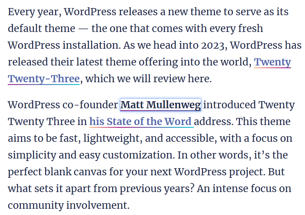 For the last examples, let’s look at how two WordPress default themes handle hyperlink design. The first one is Twenty Twenty-Two. There is nothing too spectacular going on, the usually solidly underlined links have a dashed line underneath on hover.