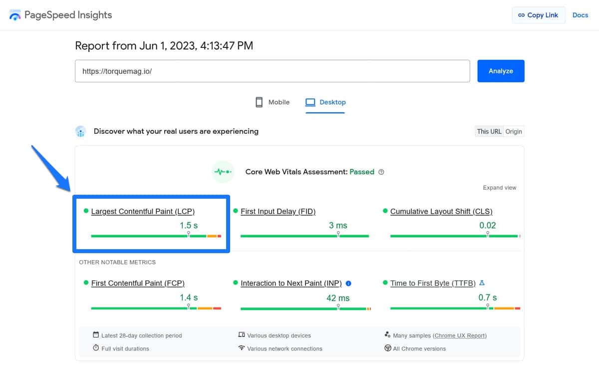 For example, when you input your website into PageSpeed Insights, you can find your LCP value and whether you have passed the test or not.