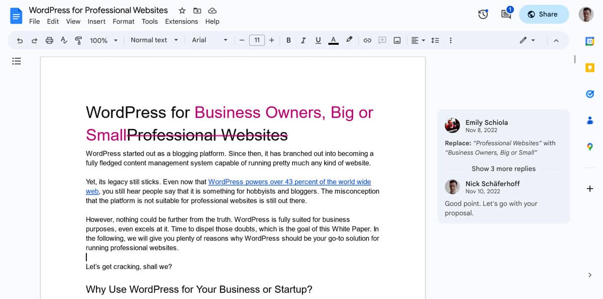 If you have ever worked on a Google document together with other people, you already know what collaborative editing is. It is the ability for several users to edit a document at the same time, comment on make changes to other people’s work, and use shared assets together.