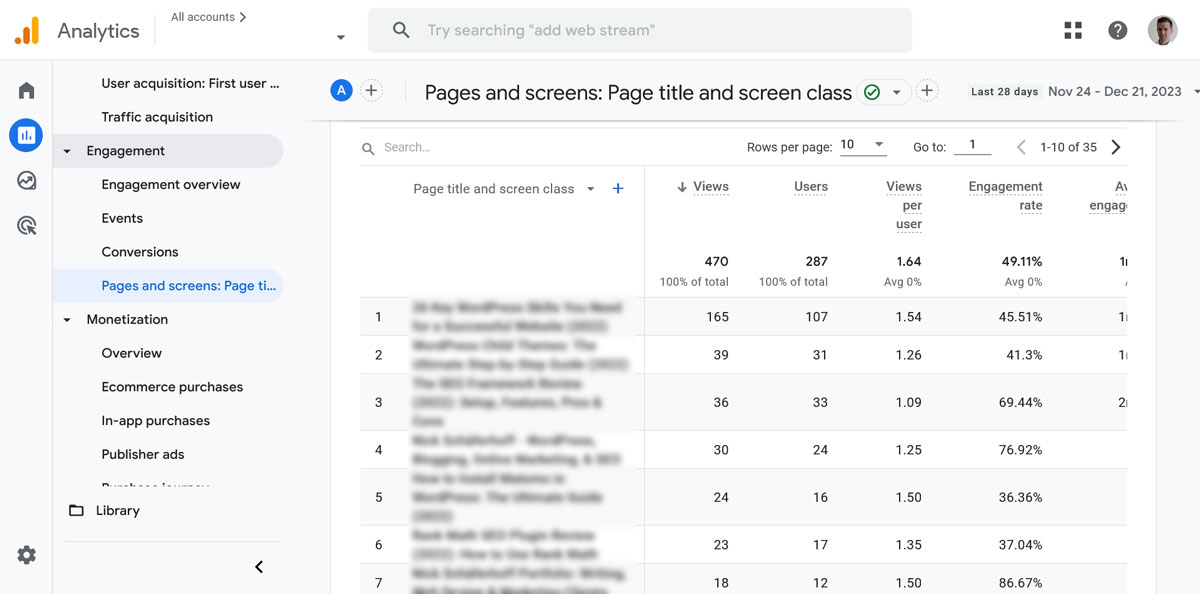 - Navigate to the Reports tab in GA4 and select Engagement > Pages and screens. This report shows detailed metrics for each page and screen (in the case of mobile apps) viewed on your site.