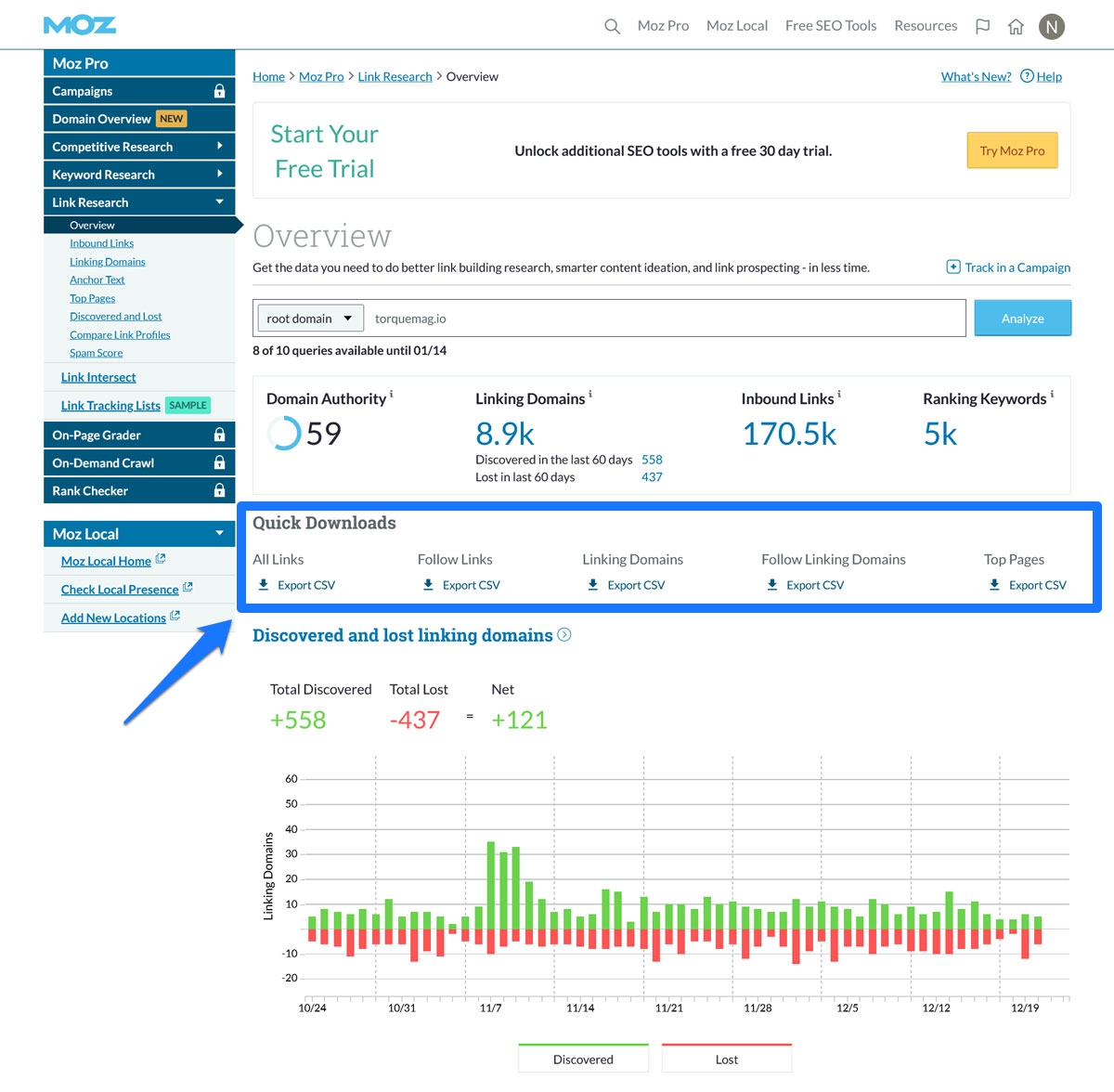 - Link Explorer (Moz): Finally, this tool is great for evaluating backlink quality and domain authority, which is a must for understanding and improving your website’s link profile.