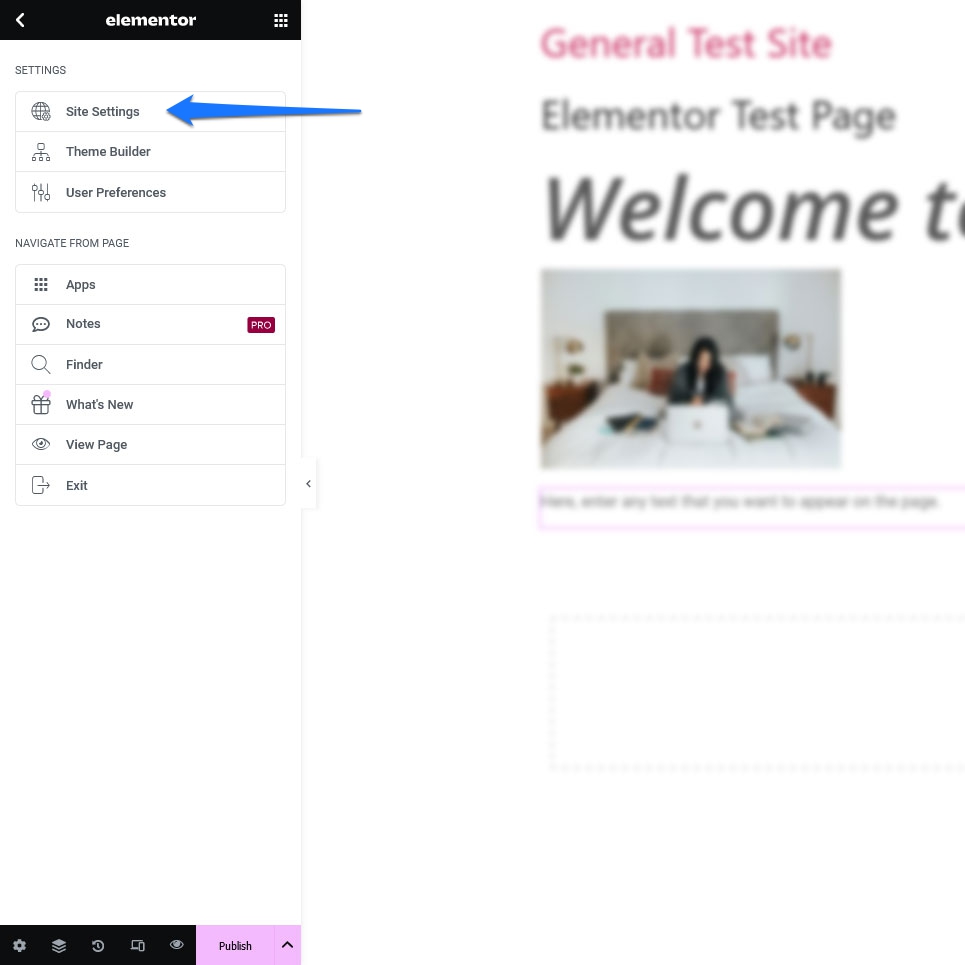 Another thing that wen need to cover in this Elementor tutorial is how to set defaults for global settings on your site, such as fonts and colors. For that, click on the hamburger menu in the top left corner of the Elementor sidebar and select Site Settings.