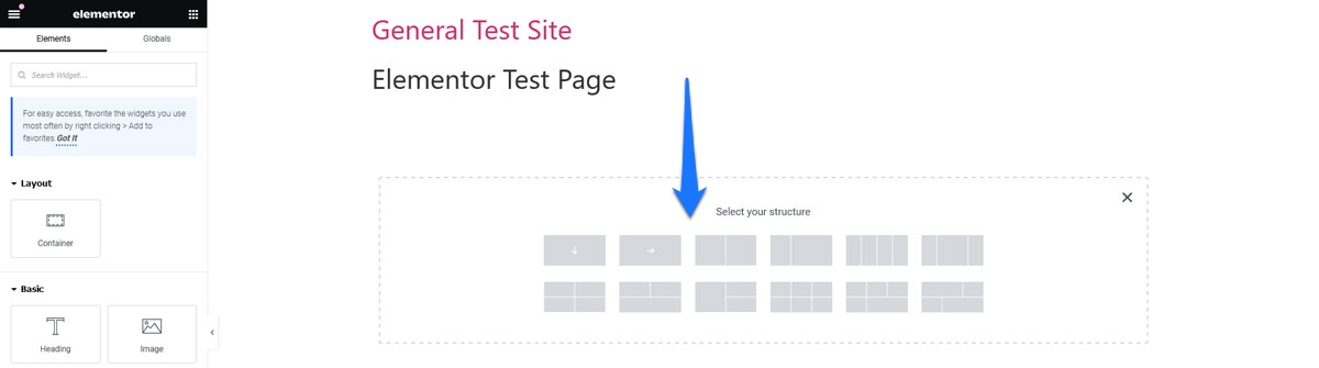Once you have settled on a basic layout, you can then add widgets. For example, you can add a heading by dragging the Heading widget into a section or column on your page.