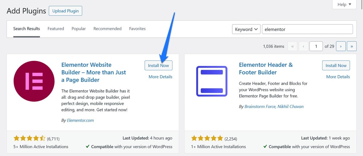 Before you can start playing around with the page editor, you’ll need to install it first. For that, find the Plugins section on your dashboard and click on Add New. In the search bar of the screen that follows, type “Elementor” and hit enter. You should see the plugin at the top of the search results.