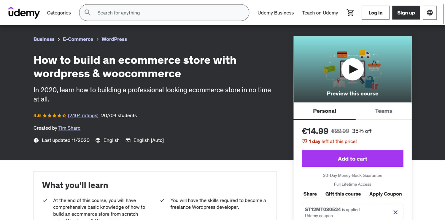 When your interest lies in business and management, it’s hard to find beginner-friendly courses that fit in this niche. This Udemy course covers topics like ecommerce and creating profitable projects with WordPress.