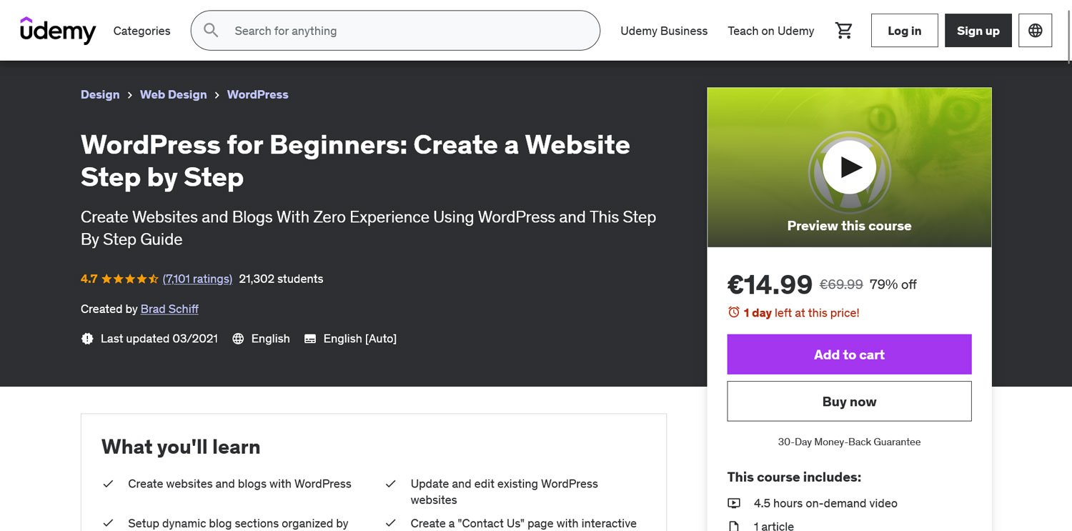 Absolute beginners who have never worked with WordPress or made a website before will get the most out of this popular and highly-rated course.